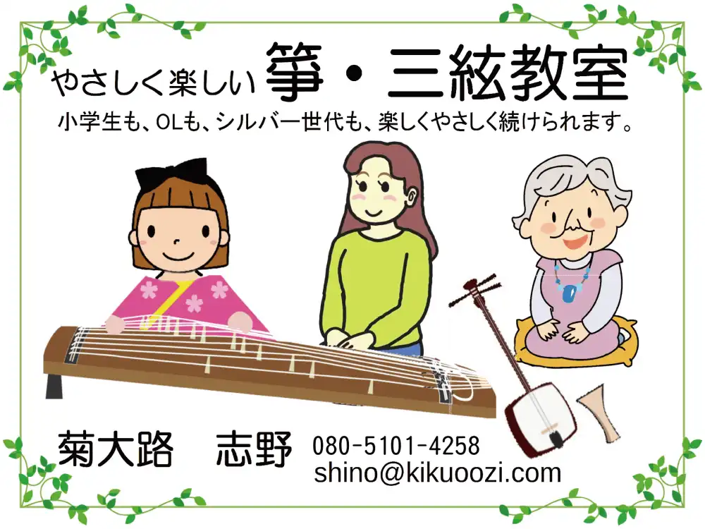 - お箏教室(琴教室、三味線教室) : ご連絡は 080-5101-4258へ。